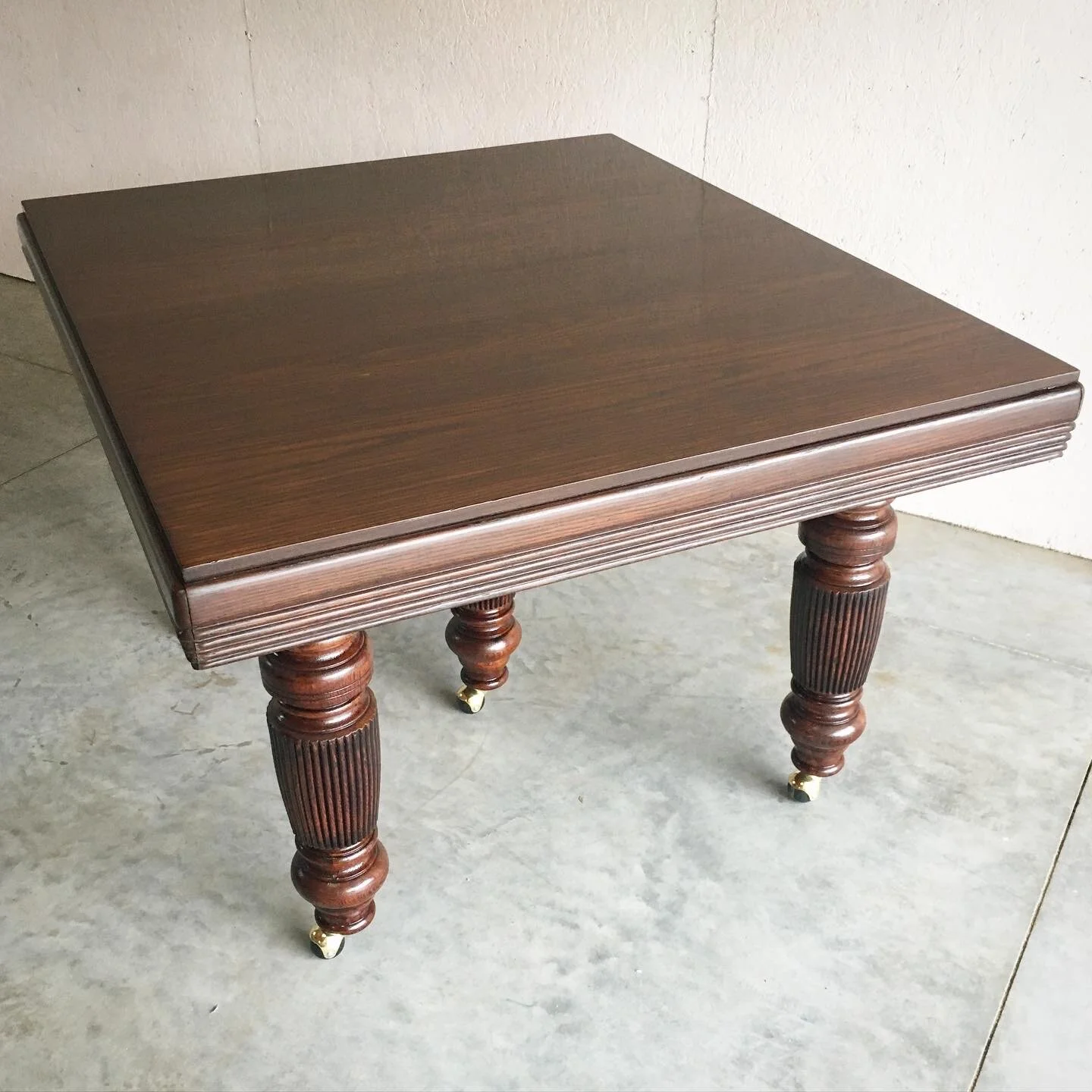 The screws holding the top of this table to the skirt had busted out of the holes clear through the sides of the table top from a century of wear and tear. Some screws were hanging in place with nothing much to hold onto and had scraped all along the leaves that store and pull out from underneath. I repaired and completely refinished the table top. Keeping the the century old shellac on the legs, I was able to touch them up while enhancing the patina. I refinished the top to match the legs and used polyurethane for durability.