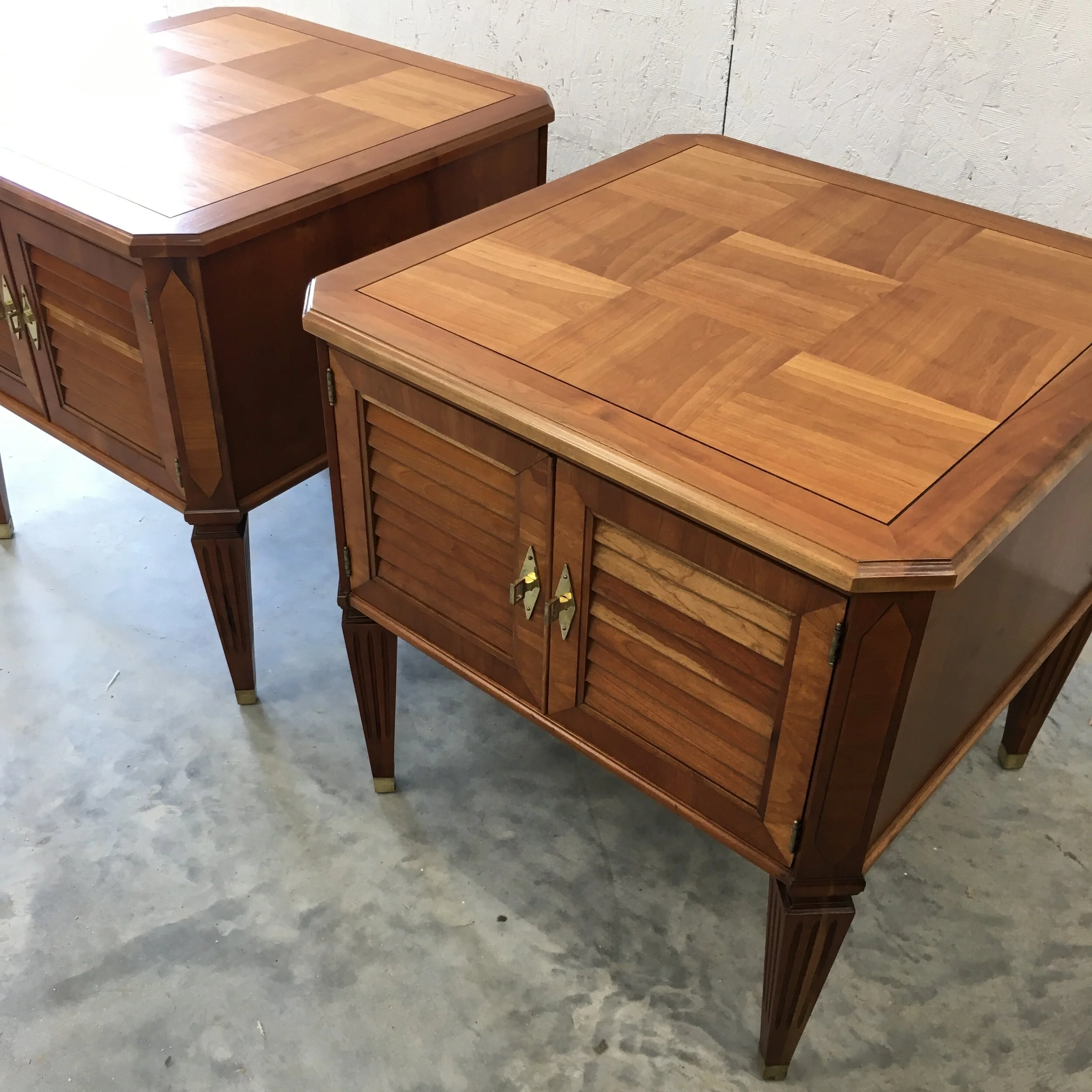 RefinishedThis pair of tables used to house stereo speakers. They were refinished inside and out. The parquet tops really popped after removing the old finish.